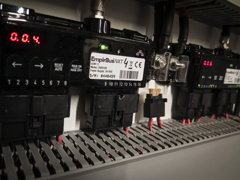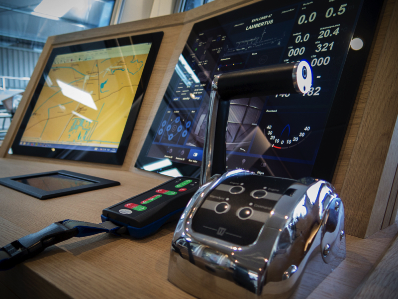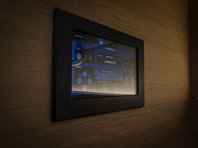 This Steeler Explorer has been fitted with a wide arrangement of Yachtcontrol products. All onboard electronics have been smoothly intergraded with the ships interior and can be operated from the glass touch screens on the dashboard. Operating and monitoring onboard equipment with the Monitoring & control software by Yachtcontrol can be done with the compact touchscreen systems installed in the Kitchen and living area or through remote access on smartphone or tablet. This allows our customer to have full access to things like camera monitoring or dimming LED lights in any location. For effortless control and manoeuvrability a wireless Dockmate system has been installed to ensure absolute precision into anchorage.