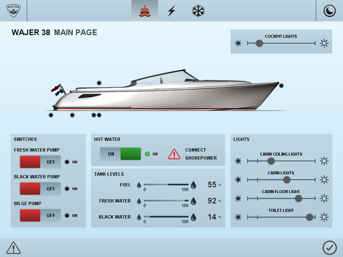 10 inch glass touchscreen Connection with Whisper Power Inverter Charger Integration with Webasto airco Integration with Raymarine screen Empirbus bus system